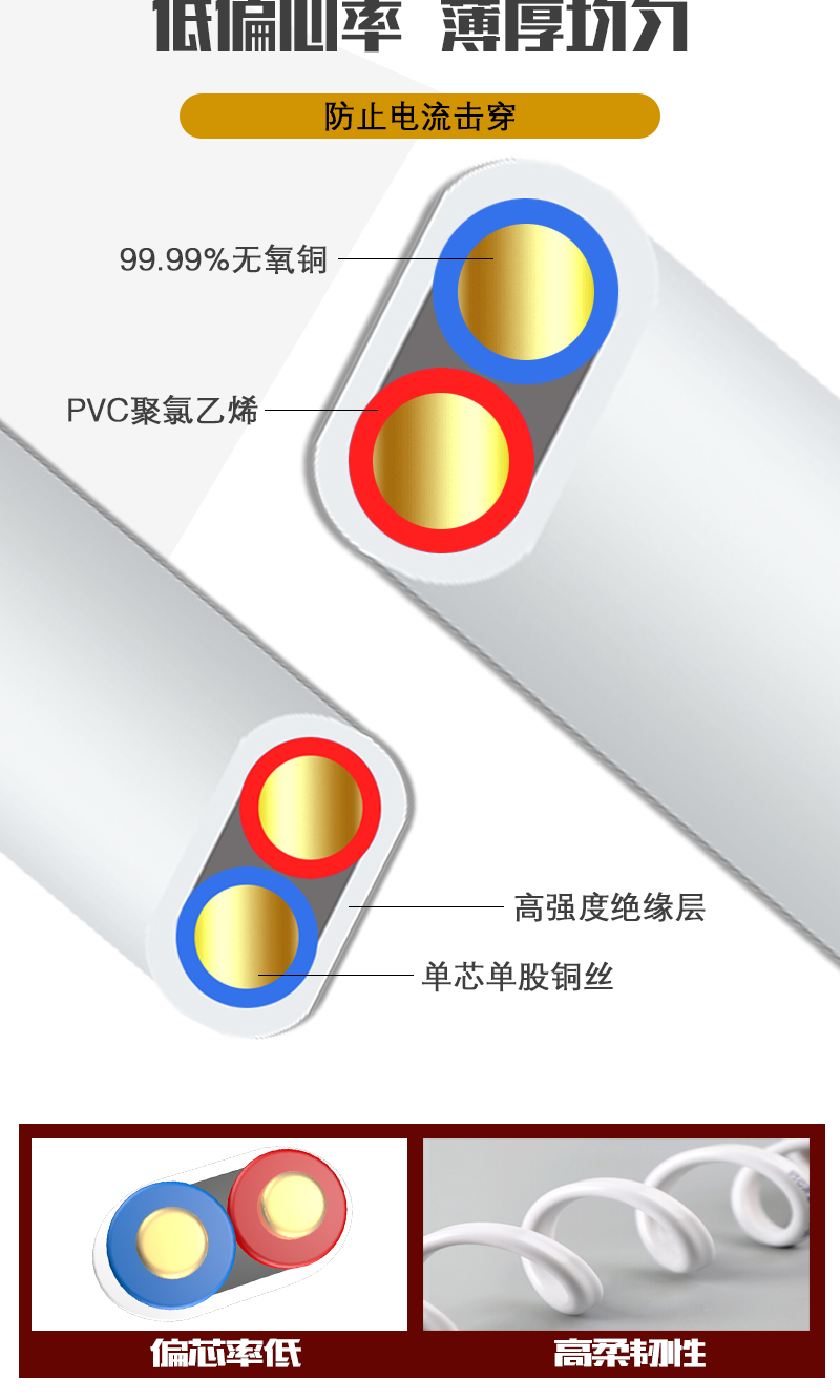 沈阳电线电缆有限公司 2芯 ZR-BVVB 2*1.0mm²--2*10mm² 铜芯电缆 阻燃铜芯聚乙烯绝缘聚氯乙烯护套扁型电缆
