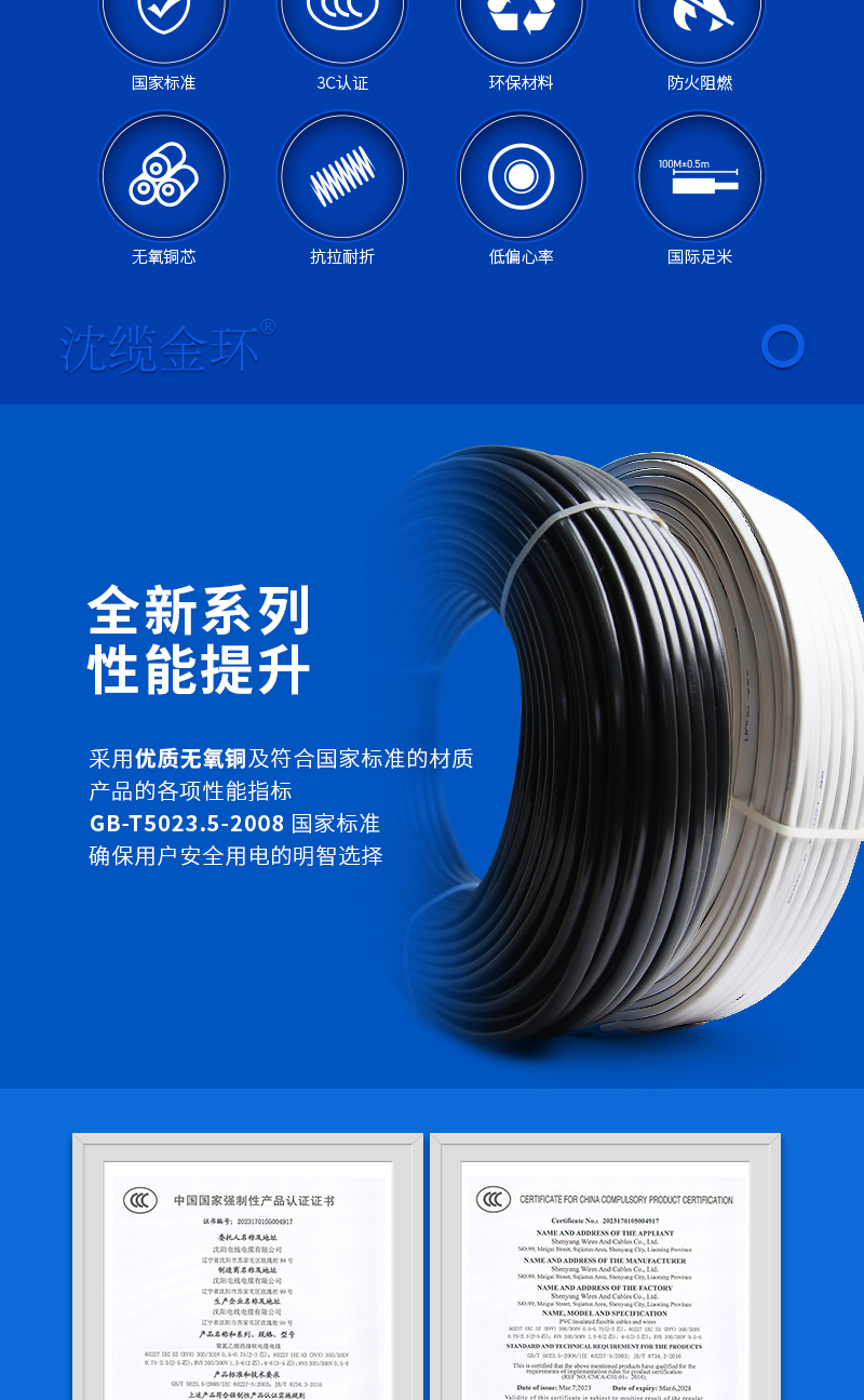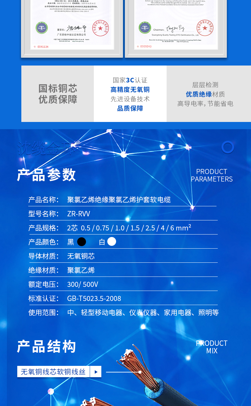 沈缆金环 2芯 ZR-RVV 1.0mm²-6mm² 聚氯乙烯绝缘聚氯乙烯护套软电缆 白色、黑色