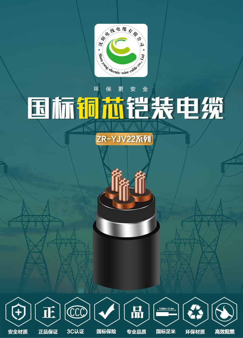 沈阳电线电缆有限公司 ZR-YJV22-8.7/15KV-3*35mm²-500mm² 国标铜芯阻燃铠装高压电力电缆 1米